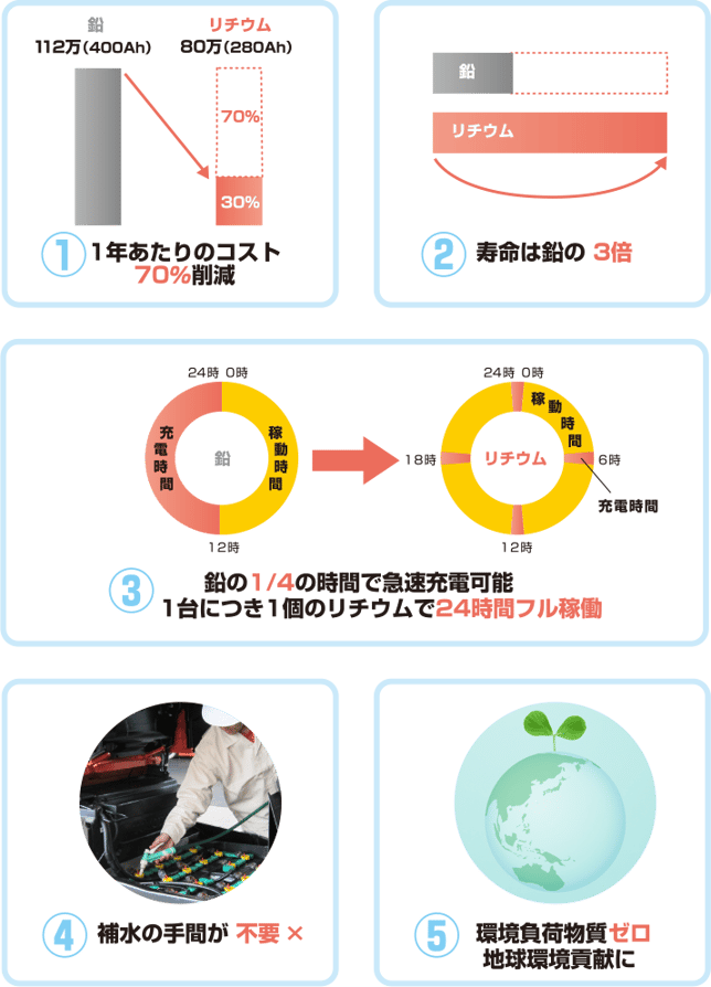 - 神奈川県の製造業様で3トンリーチでリチウムと鉛バッテリーの充電効率を測定して、リチウムが25%効率が良いことが検証されました。詳しくはこちら