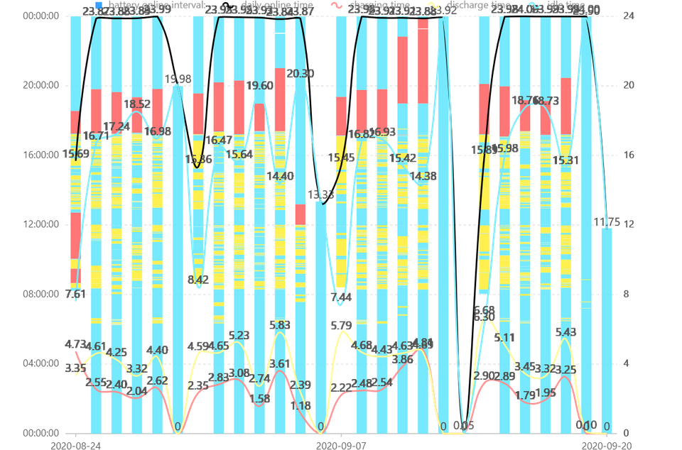 - 導入前と稼働時間は変わっていないようです。この稼働で純正のバッテリーは 6 年持ったことになります。平均毎日 60 %~ 70 %程度放電していますので、カタログ値で 1300 サイクル程度の寿命で、年間 250 日稼働とすると 5.2 年ですので、ほぼ計算が合います。バッテリーの稼働状況と寿命の相関が見える化されるのは貴重なデータです。
